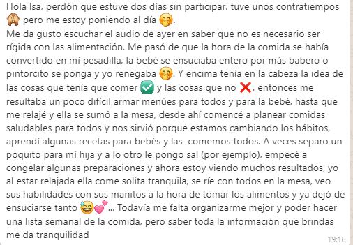 EXCELLENT Basée sur 31 avis Publié sur Daiana De la vegaTrustindex vérifie que la source originale de l'avis est Google. Isa es una verdadera experta en crianza y una persona maravillosa. Siempre ha estado allí para responder a mis preguntas y ofrecerme orientación y apoyo. Me ha ayudado a sentirme más segura y confiada como madre. Ojalá todos puedan coincidir alguna vez con ellaPublié sur maria eugenia pisacretaTrustindex vérifie que la source originale de l'avis est Google. Muy buena experiencia! Super claro y concretoPublié sur Mabe BelTrustindex vérifie que la source originale de l'avis est Google. Quiero expresar mi más sincero agradecimiento a Isa 🥰 que me brindó todo su apoyo y guía. Me sentí muy cómoda y segura durante toda la sesión y su ayuda fue realmente invaluable. Fue muy amable, paciente y profesional y me proporcionó consejos y soluciones prácticas que me ayudaron a superar mis problemas con la lactancia. Me sentí muy bien atendida y apoyada, y su ayuda hizo una gran diferencia en mi experiencia de lactancia. ¡Muchísimas gracias por todo! MabelPublié sur Diana OrdazTrustindex vérifie que la source originale de l'avis est Google. 1000% recomendada, el mejor apoyo personalizado, conocimiento, empatía, acompañamiento, te explica hasta la más mínima duda mil veces, siempre dispuesta, muchas gracias Isa!Publié sur Ori CaimiTrustindex vérifie que la source originale de l'avis est Google. Gracias Isa por tu calidez humana y experiencia profesional, estoy muy contenta de haberte encontrado y sentirme acompañada durante la lactancia con mi bebito! ♥️ Super recomendable para todas las mamás que necesiten una pueri/asesora de lactancia con conocimiento y empatía!Publié sur Gabriela monasterioTrustindex vérifie que la source originale de l'avis est Google. Excelente Isa gracias por la paciencia y por el Compromiso recomiendo tus consultas ciegamentePublié sur marina sTrustindex vérifie que la source originale de l'avis est Google. La verdad que mi experiencia con Isa es un antes y un después con la lactancia. Gracias a su dedicación, calidez y buena onda. Con mi hijita de 2 meses y con la guia de ella puedo al fin!!! disfrutar de una LACTANCIA SIN DOLOR antes de ella, sufrí muchisimo de grietas y una tan severa de faltarme tejido del pezón. Con Isa pude vencer el miedo a amamantar y estar sin dolor. GRACIAS ISA GENERAS MUCHA CONFIANZA Y SEGURIDAD!!Publié sur ferfarias83Trustindex vérifie que la source originale de l'avis est Google. Me ayudó mucho la información que me dió en su curso para la vuelta al trabajo y armado de banco de leche. Lo recomiendo!Publié sur Lau FracassaTrustindex vérifie que la source originale de l'avis est Google. Isa es una excelente profesional y una gran persona! Soy madre soltera y sus consejos y acompañamientos han sido fundamentales para ganar confianza y seguridad en mi lactancia y en el cuidado de mi hija. La recomiendo 100%!